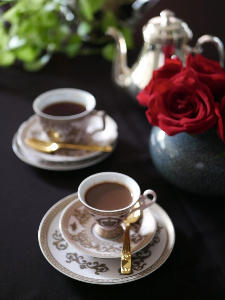 大人シックなヴァレンタインのテーブルスタイリングで香り豊かな紅茶やホットチョコレート風ミルクティーなどをお楽しみ頂く企画です